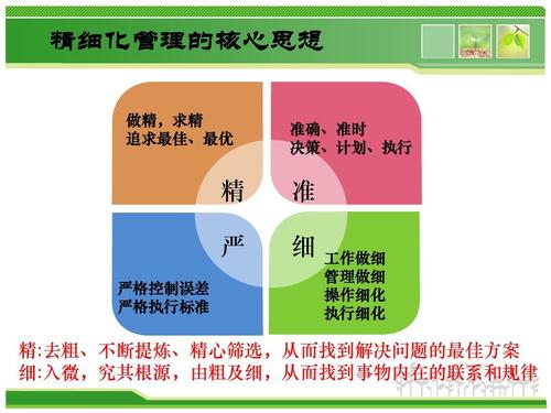 精細化管理是一種對戰略目標進行分解細化和責任落實的過程,是讓企業的戰略規劃能有效地貫徹到每個環節并發揮作用的過程,是一種貫穿于企業所有環節的全面管理模式,同時也是增強企業整體執行能力,實現最終發展目標的一個重要途徑。實施精細化管理,就是從小事入手,對每個細節都精益求精,做到事事有人管、處處有人管、事事有檢查、時時有計劃、事事有總結,杜絕管理上的漏洞,消除管理上的盲點,提高管理效能。