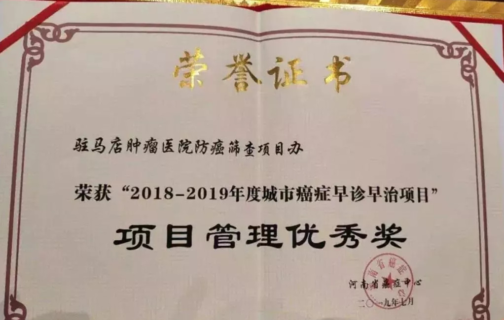 近日,在河南省癌癥中心、河南省腫瘤醫院召開的2019年度城市癌癥早診早治項目河南省啟動會議上,集團成員企業河南大河醫療集團有限公司旗下的駐馬店腫瘤醫院榮獲2018-2019年度城市癌癥早診早治項目“項目管理優秀獎”和“國家重大公共衛生專項河南省城市癌癥早診早治項目指定篩查機構”。