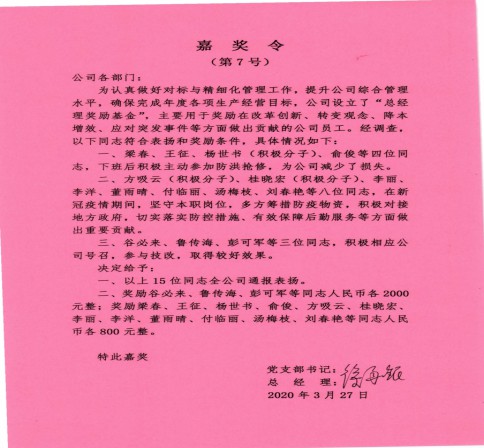 為促進企業(yè)發(fā)展,推動工作創(chuàng)新,公司和黨支部共同設立了獎勵基金,每年10萬元。用于獎勵在支部建設、改革創(chuàng)新、產品研發(fā)、降本增效、企業(yè)文化創(chuàng)建等方面做出貢獻的黨員與員工。例如:2018年9月24日,技術骨干、發(fā)展對象方吸云利用業(yè)余時間,解決了雷蒙磨運行中的結垢問題,獲得獎勵8000元;2020年3月22日,生產骨干、預備黨員楊世書等四人放棄休息時間,趕到公司積極參加抗洪搶險,避免公司財產造成重大損失,獲得獎勵4200元;2020年6月12日,黨員湯玲玲、預備黨員桂曉宏、入黨積極分子蔣治宏、一線員工朱維翠等9位同志主動參加無償獻血活動,獲得獎勵5800元;桂曉宏、方吸云在新冠疫情嚴重的時候,堅守崗位,吃住在公司,多方籌措防疫物資,切實落實防疫措施,保證了生產秩序的穩(wěn)定,等等……。據統(tǒng)計,自2017年以來,公司共發(fā)放獎勵29.16萬元,獎勵62人次,其中普通黨員及一線員工占70%以上。通過實施精準獎勵,極大地調動了員工的積極性和創(chuàng)造性,主人翁意識不斷增強,推動了公司的業(yè)績提升,通過采取安全“負激勵”措施,公司成立至今無一例重大安全事故發(fā)生,生產經營及黨組織建設呈現良好發(fā)展態(tài)勢。2019年-2020年度,連續(xù)創(chuàng)造人均繳納稅收超過10萬元的佳績。