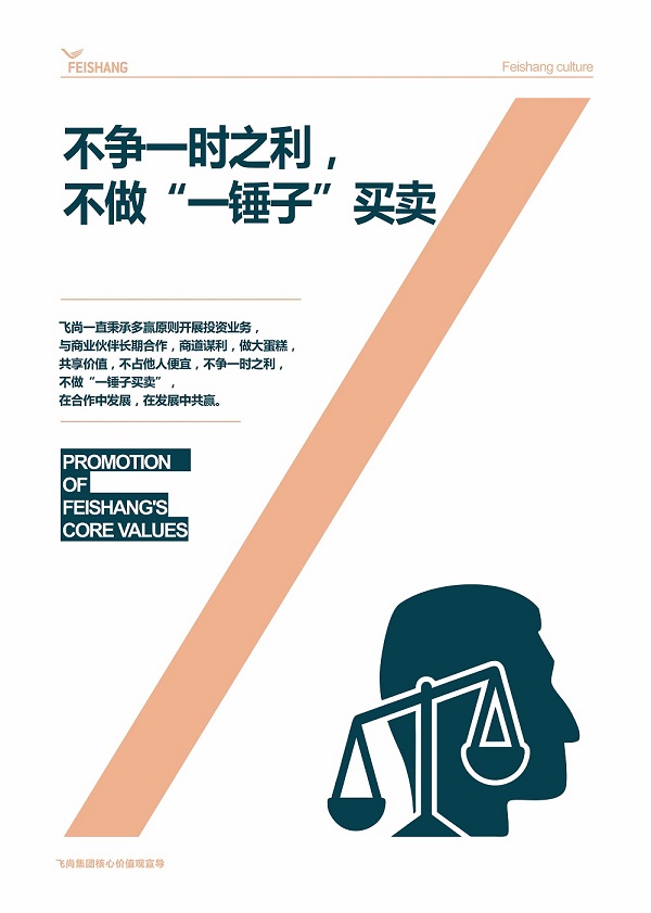 飛尚的核心價值觀具體表現為追求整體和長遠利益,實現股東、員工、政府、社會多方共贏。認同這樣的核心價值觀的員工和合作伙伴與飛尚在最終利益上完全一致,飛尚在為社會創造財富的同時也在為認同核心價值觀的“奮斗者”創造財富。正是在這種核心價值觀的指引下,飛尚集團在二十多年的發展中克服重重困難,一路凱歌,即使遭遇困境也巍然不動,越戰越勇。